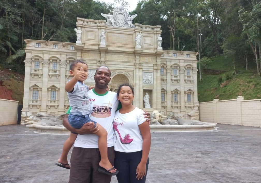O motorista Alexandre dos Santos, 41 anos, garantiu uma recordação com os filhos da réplica da ‘Fontana di Trevi’ de Serra Negra (SP) — Foto: Fernando Evans/g1