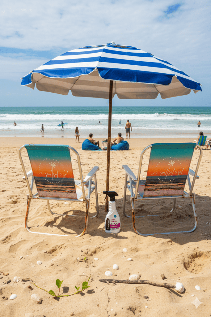 Antes de sair, e quando voltar, aplique Adeus Maresia no guarda-sol, nas cadeiras e nas barracas.