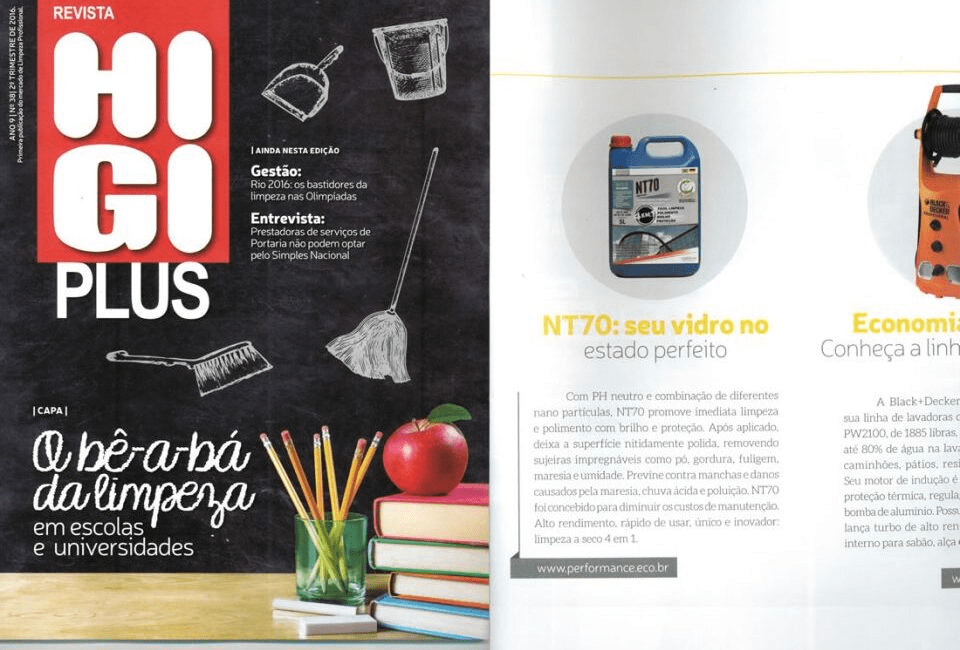 A edição nº38 da Revista Higiplus (2016), uma das principais publicações voltadas ao setor de limpeza profissional e facilities, destacou o NT70, produto da linha nano4you, como solução técnica de alto desempenho para limpeza e manutenção de vidros em ambientes internos, externos e automotivos.
