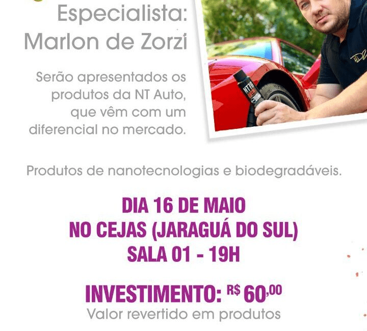 No próximo dia 16 de maio de 2019, será realizado o 3º Workshop oficial da linha nano4you AUTO, desta vez na cidade de Jaraguá do Sul (SC), em parceria com a tradicional loja Tintas Maba. O evento contará com a presença especial de Marlon De Zorzi (MDZ Espelhamento), referência nacional em detalhamento automotivo.